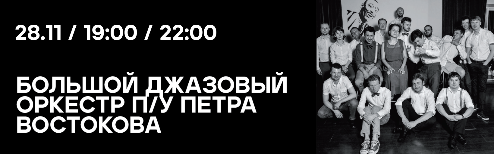 На концерт "Большой джазовый оркестр п/у Петра Востокова" всегда собирается большое количество гостей, поэтому мы организуем два концерта ( в 19:00 и в 22:00). Музыканты будут играть более 1 часа, за это время вы сможете насладиться музыкой и получить много впечатлений.