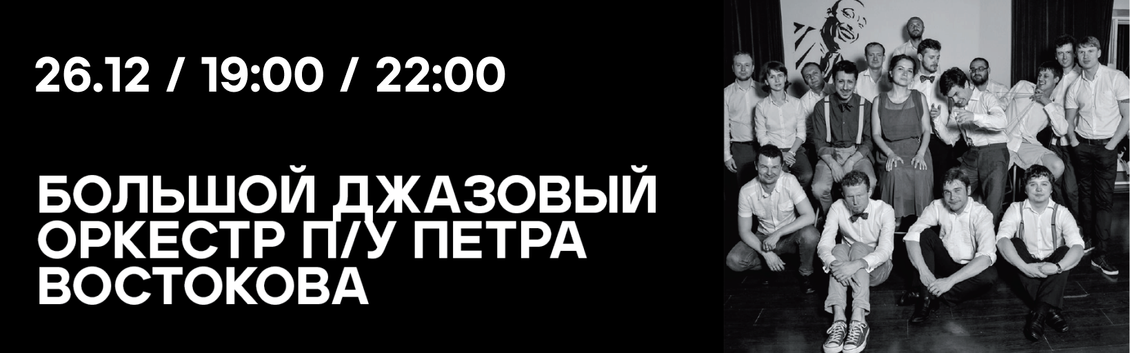 На концерт "Большой джазовый оркестр п/у Петра Востокова" всегда собирается большое количество гостей, поэтому мы организуем два концерта ( в 19:00 и в 22:00). Музыканты будут играть более 1 часа, за это время вы сможете насладиться музыкой и получить много впечатлений.