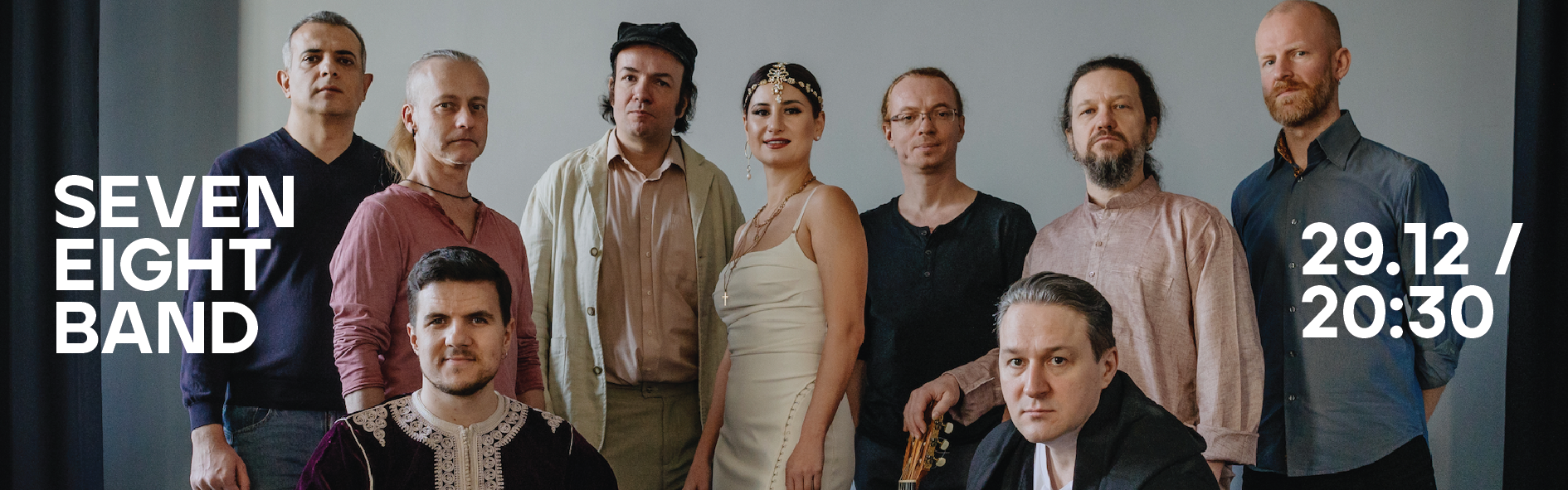 Основа репертуара Seven Eight Band – музыка Средиземноморья и Востока, его экзотическая энергия и пьянящий ритм «на семь восьмых». Саунд – щедрый, близкий к оркестровому, состав - звездный, часто дополняемый знаменитыми special guests.