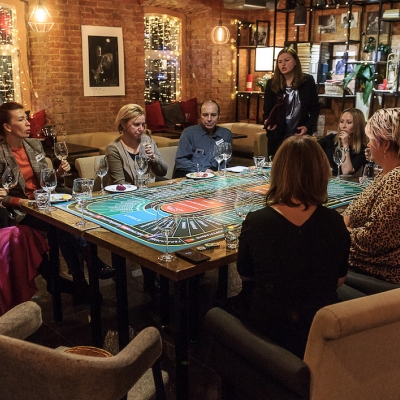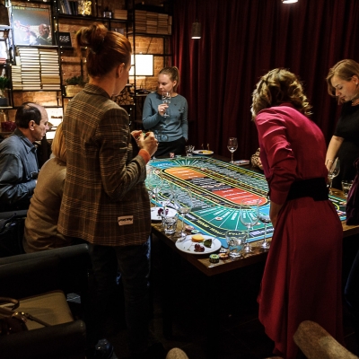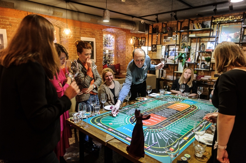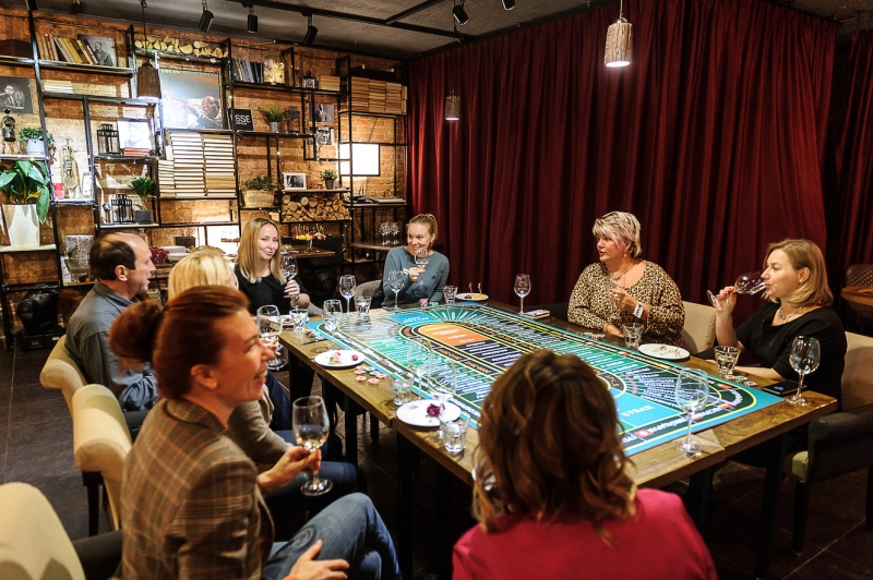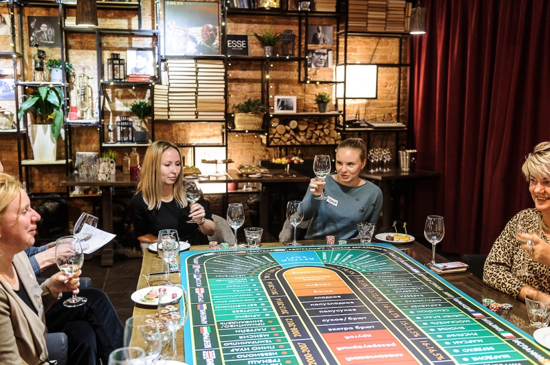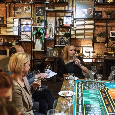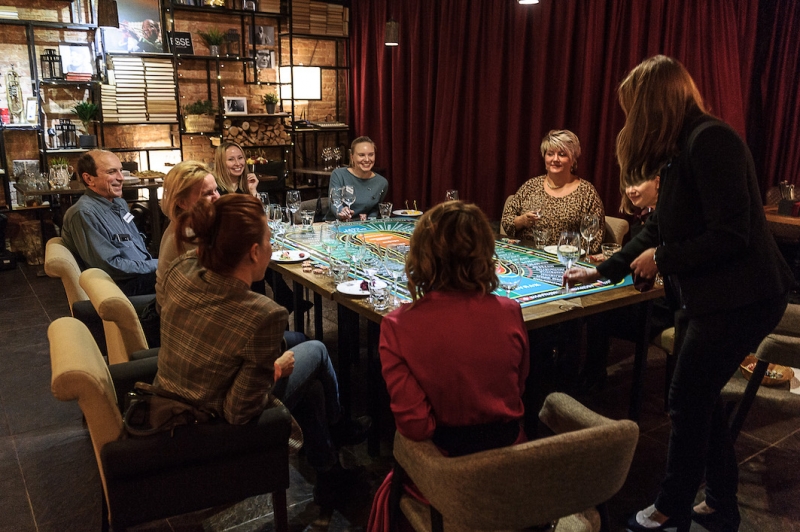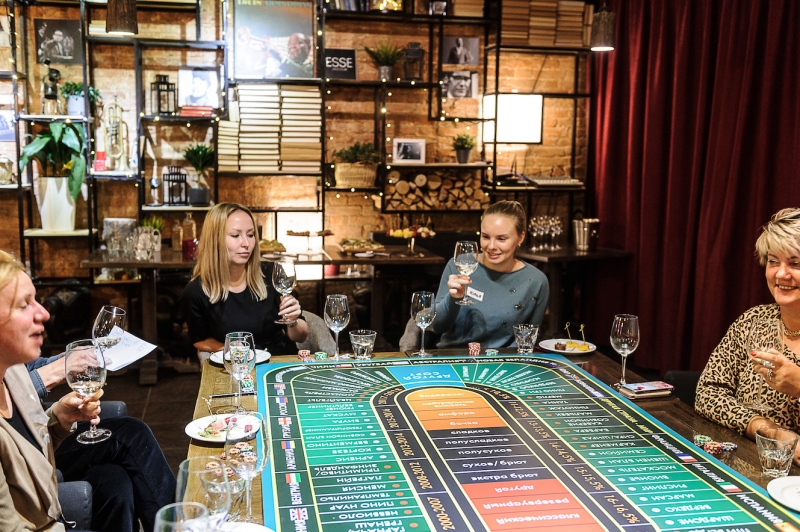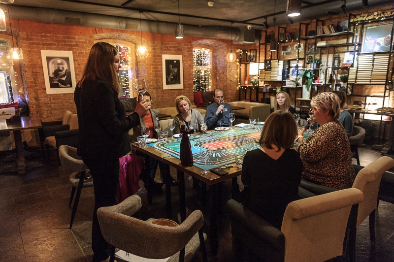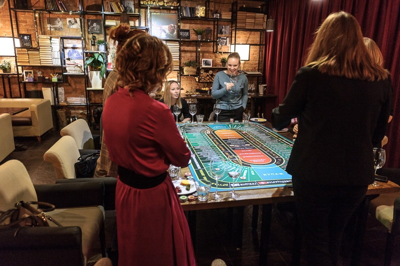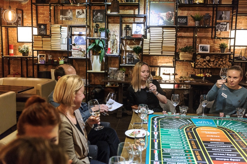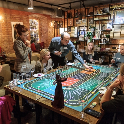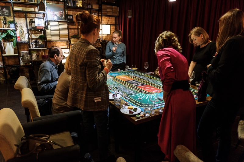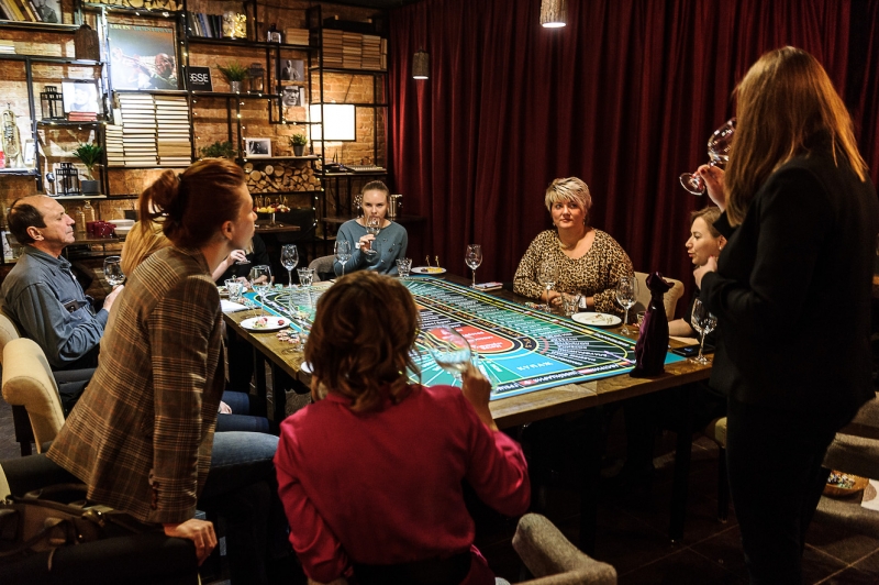 Действо происходит за столом, стилизованном под рулетный стол для ставок. На столе бокалы, ваши фишки и изысканный сет из закусок, подобранный нашим шеф-поваром специально для правильного раскрытия вкуса вина.