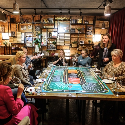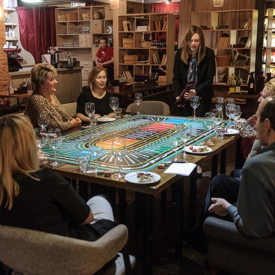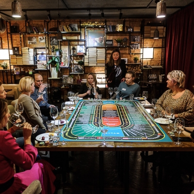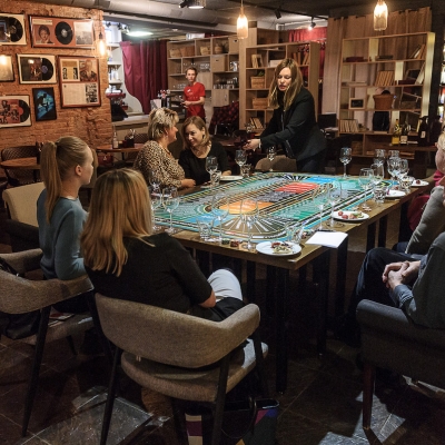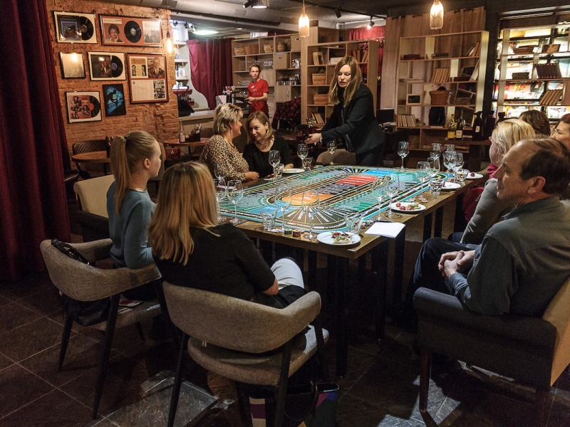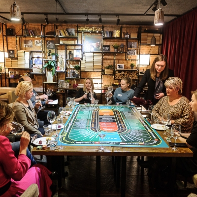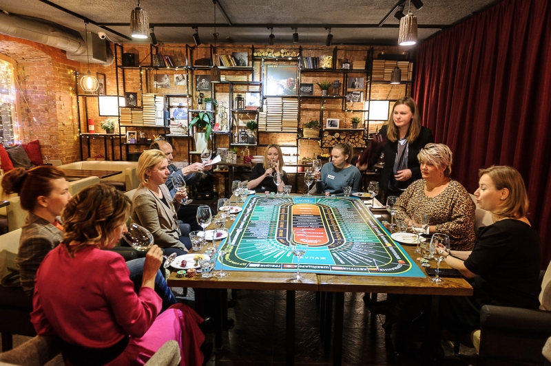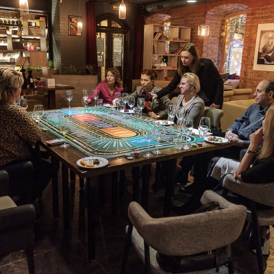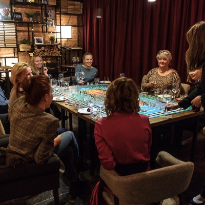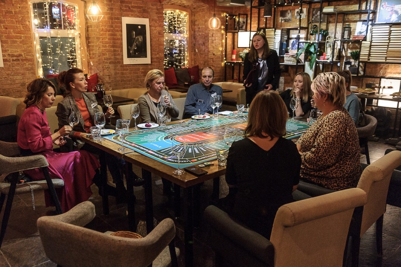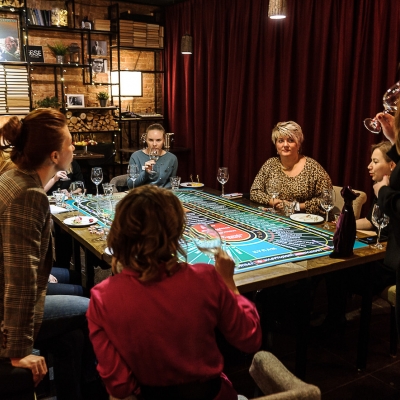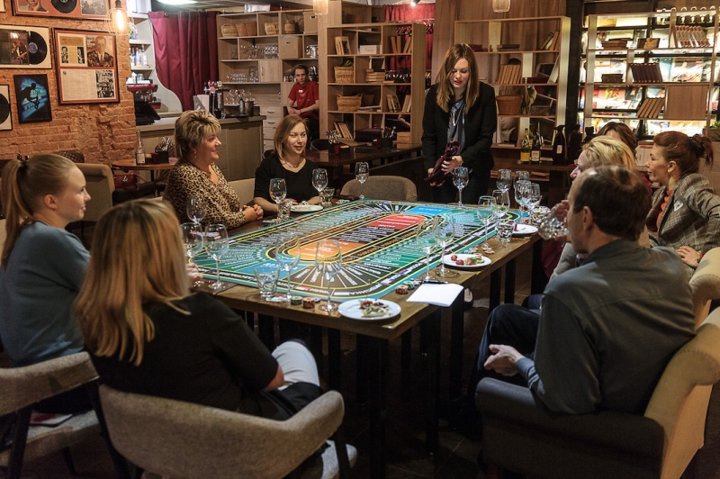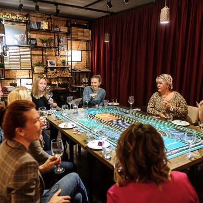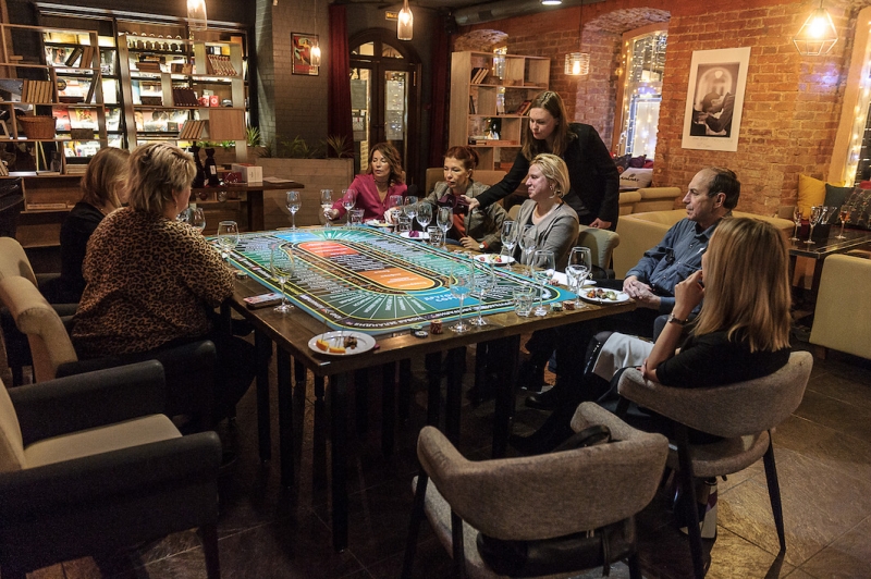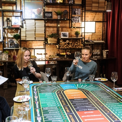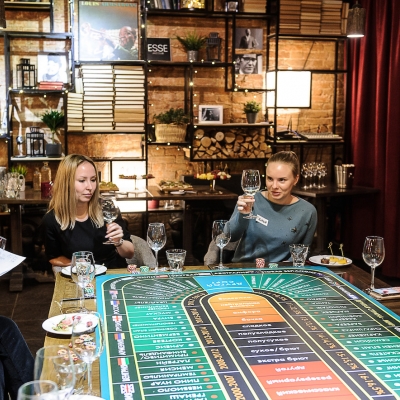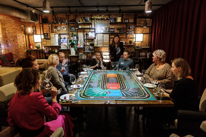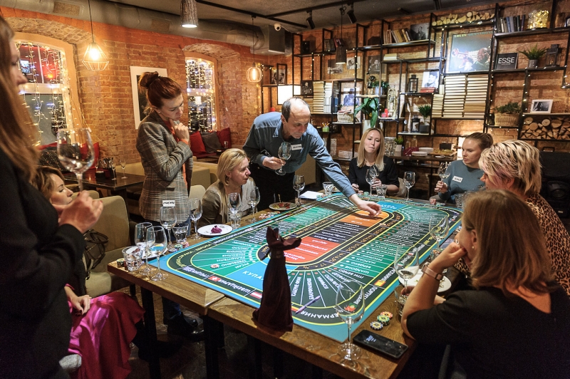 Действо происходит за столом, стилизованном под рулетный стол для ставок. На столе бокалы, ваши фишки и изысканный сет из закусок, подобранный нашим шеф-поваром специально для правильного раскрытия вкуса вина.