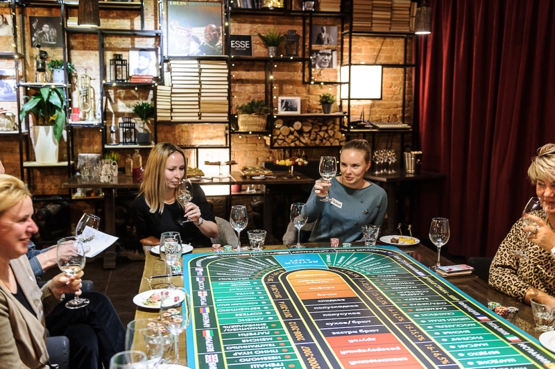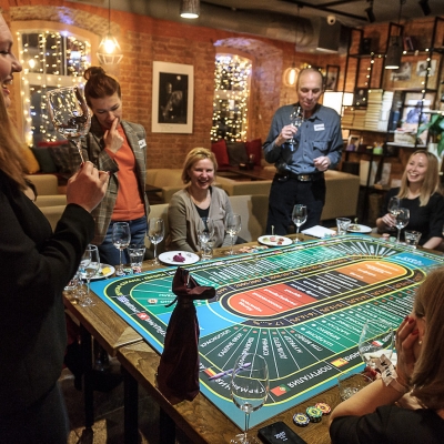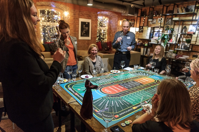 Крупье разливает вино участникам игры из замаскированной бутылки. Дегустация сопровождается обсуждением ароматики и предположениями участников. Делаются ставки. За правильный ответ фишки удваиваются, неправильный – ставка уходит в банк казино. Продолжительность игры: 6 бутылок вина :)