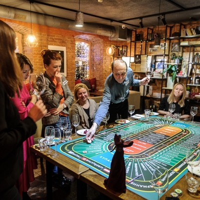 Это игра-дегустация, в ходе которой участники дегустируют вина вслепую и отгадывают его характеристики: сорт, регион происхождения, год урожая, крепость и т.п. Веселый и познавательный досуг, сочетающий в себе азартный дух Лас-Вегаса и благородный мир вин, поможет вам и вашим друзьям хорошо провести время и развить дегустационные навыки. Как в настоящем казино, мы предлагаем реальный выигрыш – пригласительный на два лица на концерт в нашем клубе.