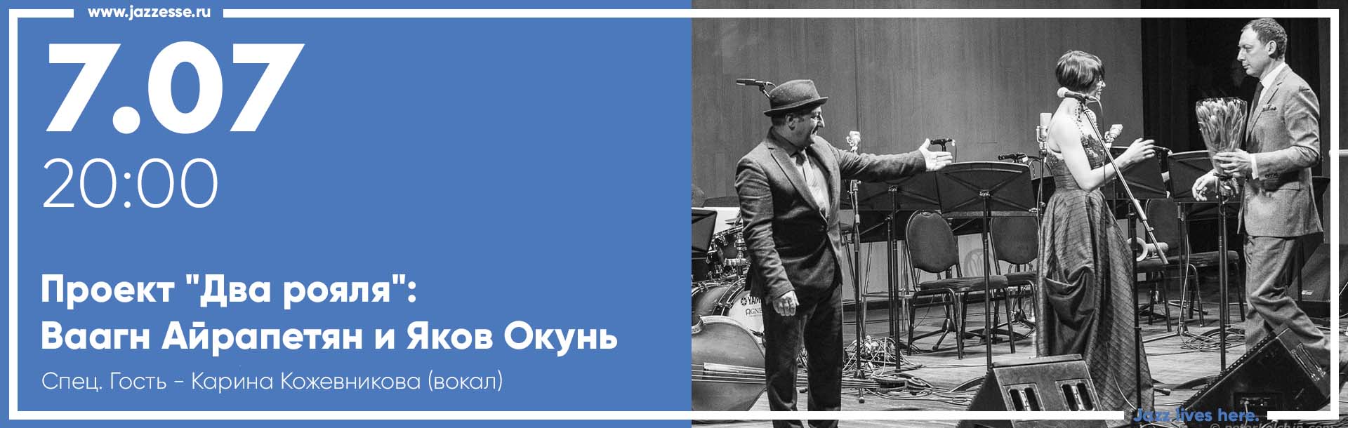 В этот раз на сцене встретятся Яков Окунь и Ваагн Айрапетян. Компанию им составит первоклассная ритм-секция, состоящая из Владимира Кольцова-Крутова на контрабасе и Павла Тимофеева за барабанами. Обрамит этот интересный ансамбль великолепная Карина Кожевникова.