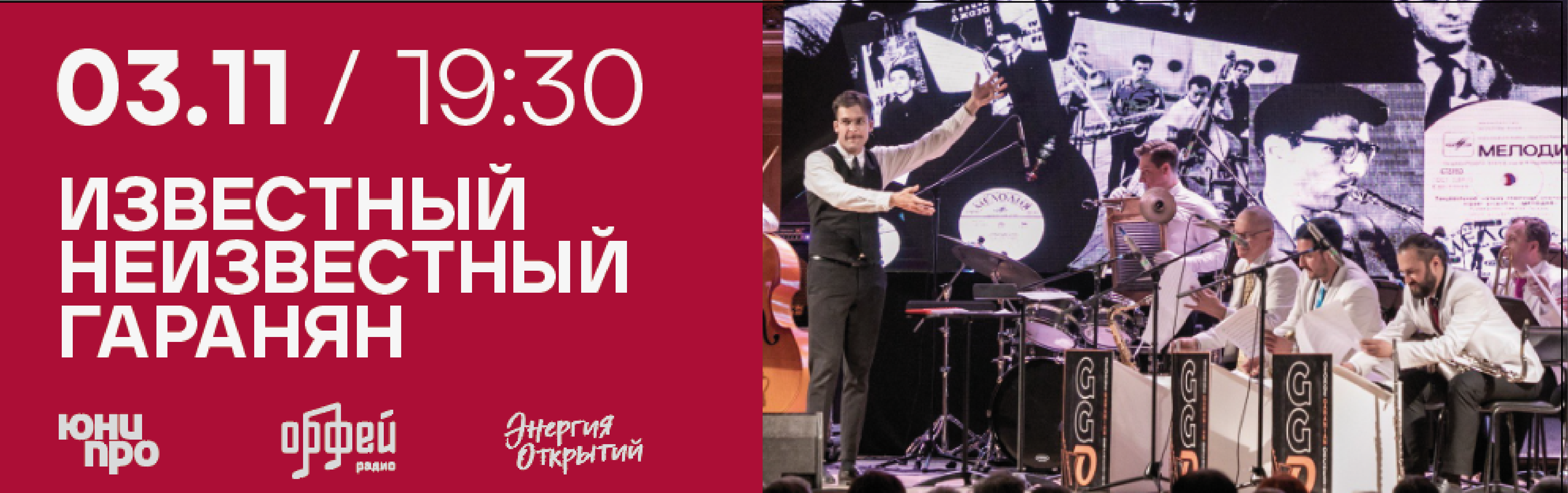 Известный Неизвестный Гаранян – это концерт музыки и аранжировок легенды Отечественного джаза Георгия Гараняна. Георгий Гаранян знаменит созданием легендарного Ансамбля «Мелодия», образцовых биг-бендов страны (Московского, Краснодарского), культовых малых составов, в числе которых «Золотая восьмёрка», Супертрио «Гаранян-Крамер-Кузнецов», великолепными аранжировками и музыкой для кино, театров, мультфильмов и даже цирка. Он сделал первые профессиональные записи с Владимиром Высоцким и выпустил множество записей со всеми звездами советской эстрады. По его учебнику-бестселлеру «Основы эстрадной и джазовой аранжировки» учатся музыканты всей страны.